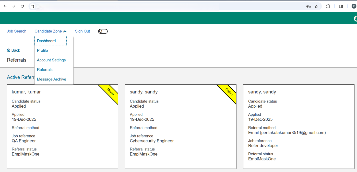 Path: Login to a Talent Gateway >> Candidate Zone >> Referrals >> Active Referrals