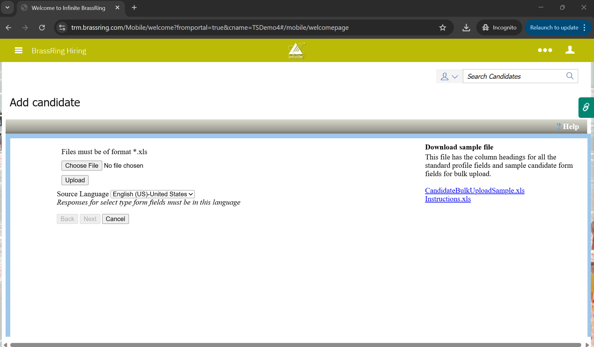 These details can be added directly into the ‘CandidateBulkUploadSample.xls’ file. Once completed, users can upload this file to efficiently add candidates to their respective requisition folders.
