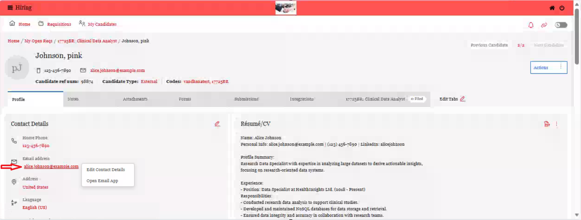 Particularly, for the ‘Email address’ field, when the user clicks on the candidate's email address, a small pop-up appears with options displayed in the order ‘Edit Contact Details’ and ‘Open Email App’ in both the old and new UIs.