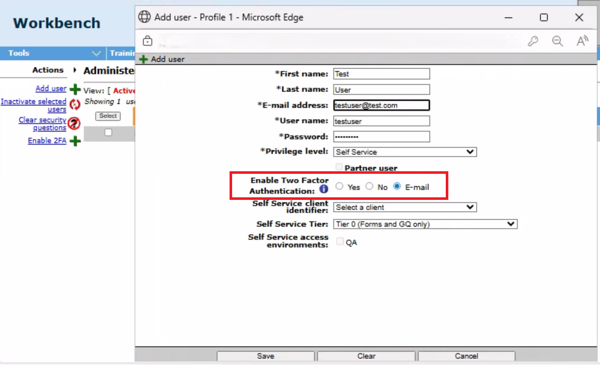 Path: Workbench >> Admin >> Administer users >> Add/Edit user >> Enable Two Factor Authentication >> Email
