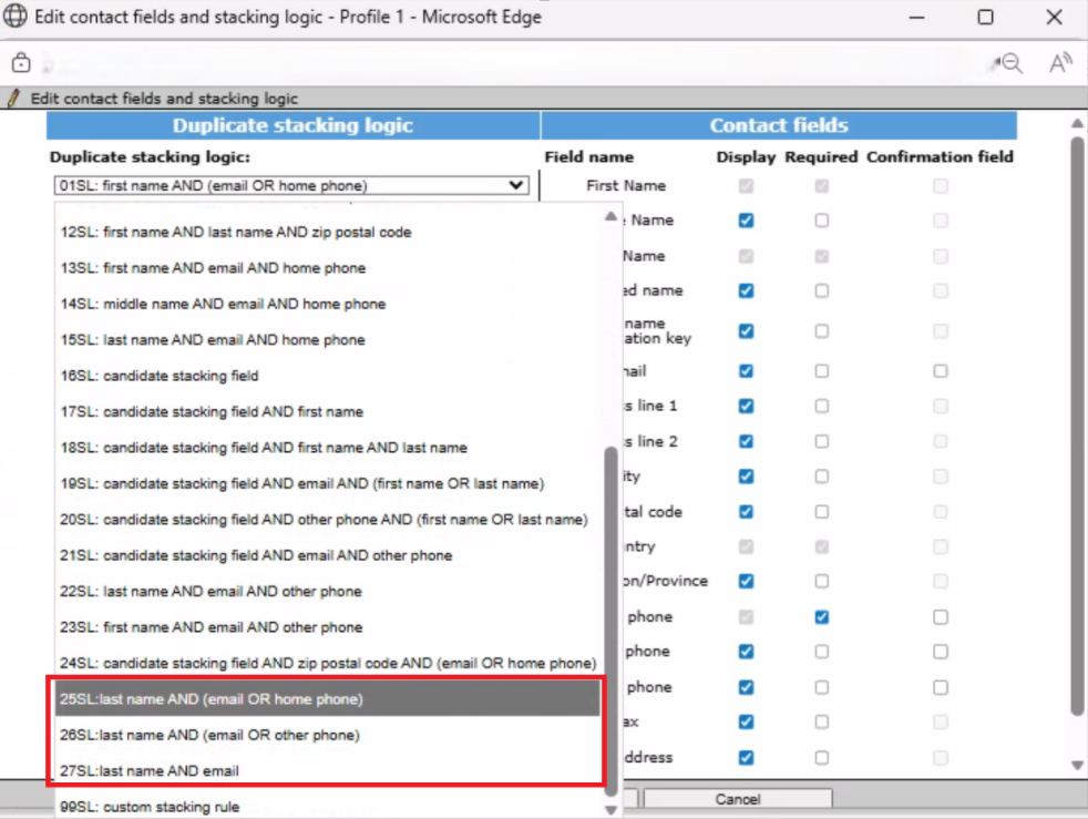 Path: Workbench >> Tools >> Talent Gateways >> Edit >> Contact fields and Stacking logic >> Edit >> Duplicate stacking logic
