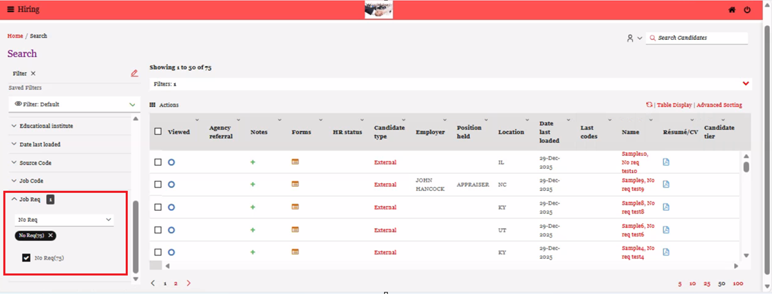 Starting with this release, a new filter option called ‘No Req’ has been added to the ‘Job Req’ Filter. This option allows users to search for candidates who have submitted applications without being associated with any specific job requisition. This feature makes it easier for users to track and manage candidates who have jobless submissions.