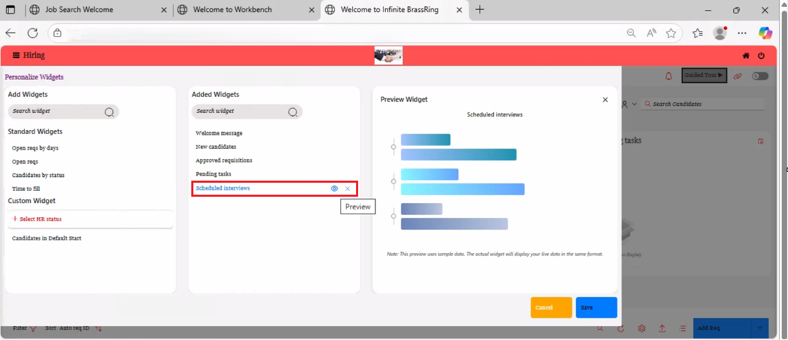 Starting with this release, we are excited to announce an enhancement to the user experience in managing and personalizing widgets on the welcome page of the BrassRing application. With this update, users can easily add, remove, or rearrange (drag and drop) widgets in the 'Personalize Widgets' section. Any changes made are immediately reflected on the welcome page and vice versa.
