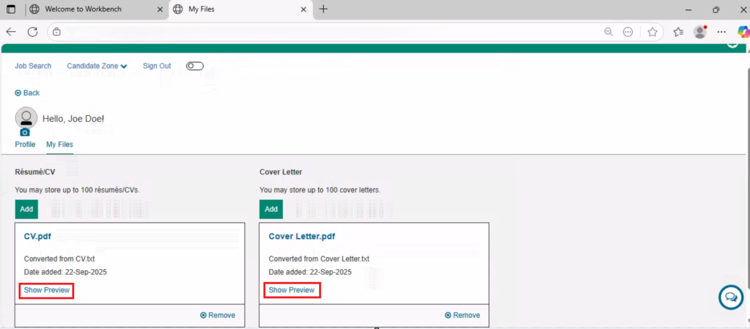 Starting with this release, as candidates may have multiple resumes or cover letters to upload, a ‘Show Preview’ link has been implemented in the apply workflow on the ‘Saved Resumes’ screen during profile information import. When a candidate uploads a resume or cover letter, the system automatically converts the file into a PDF format. This ensures a consistent and reliable preview experience across all devices and browsers. Additionally, candidates can preview their uploaded resumes or cover letters in the ‘My Files’ tab within the Profile section of the Candidate Zone on the Talent Gateway.