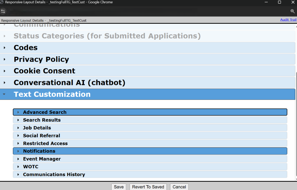 With this release, as part of the Workbench application modernization project, and to enhance the user experience. As part of this update, the remaining tab settings—Notifications, Event Manager, WOTC, and Communication History—have been relocated under the ‘Text Customization’ ribbon on the Responsive Layout page. Additionally, the ‘Text Customization’ column for editing and viewing on the Talent Gateway administration screen has been removed.