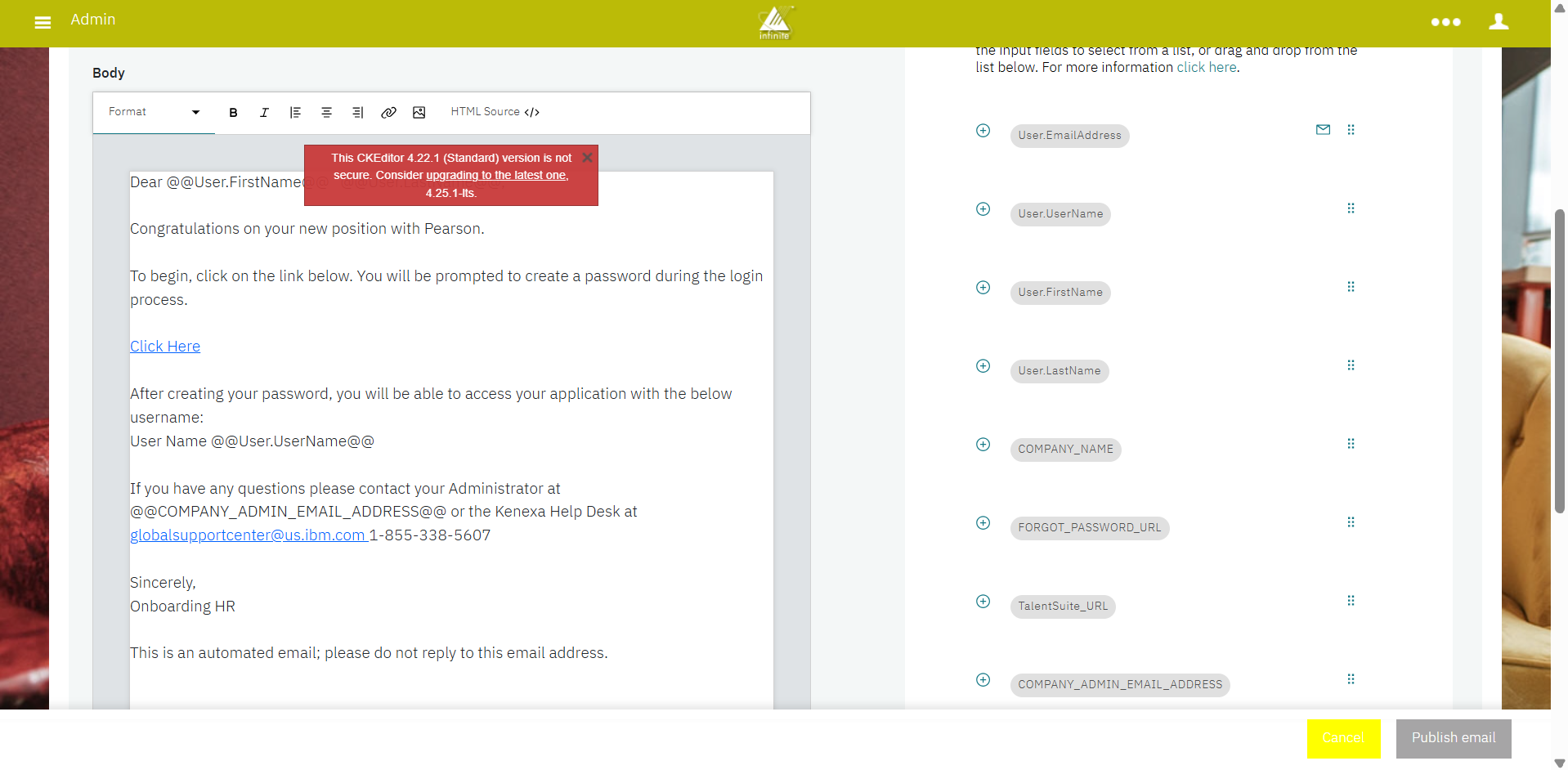 In the Admin application of the Talent Suite, the 'Manage Email Templates' screen currently uses CKEditor version 4.22.1 (Standard).