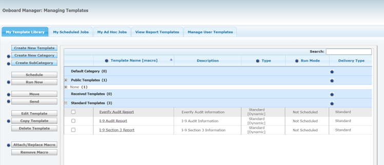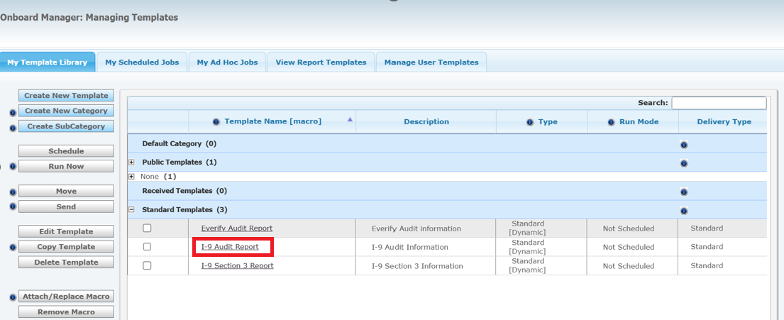 Path: Login to Talent Suite >> Onboard Manager >> Click on Hamburger icon >> Report >> Onboard Manager: Managing Templates >> Standard Templates >> I-9 Audit Report