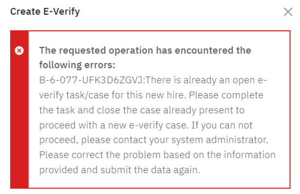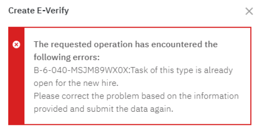 Currently, if an E-Verify task is already open for a new hire, attempting to launch a standalone E-Verify task results in a failure. The error message displayed lacks clear information and is not user-friendly.