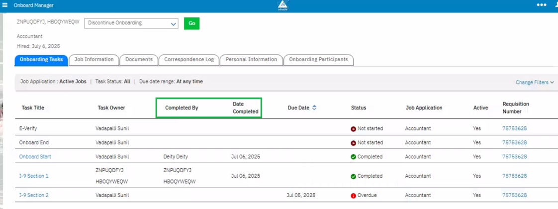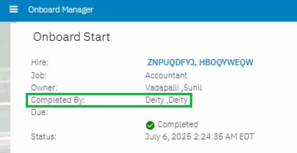 Starting with this release, Onboard Manager users can now see who completed onboarding tasks for new hires, both on the Onboarding Tasks tab and in the completed task.